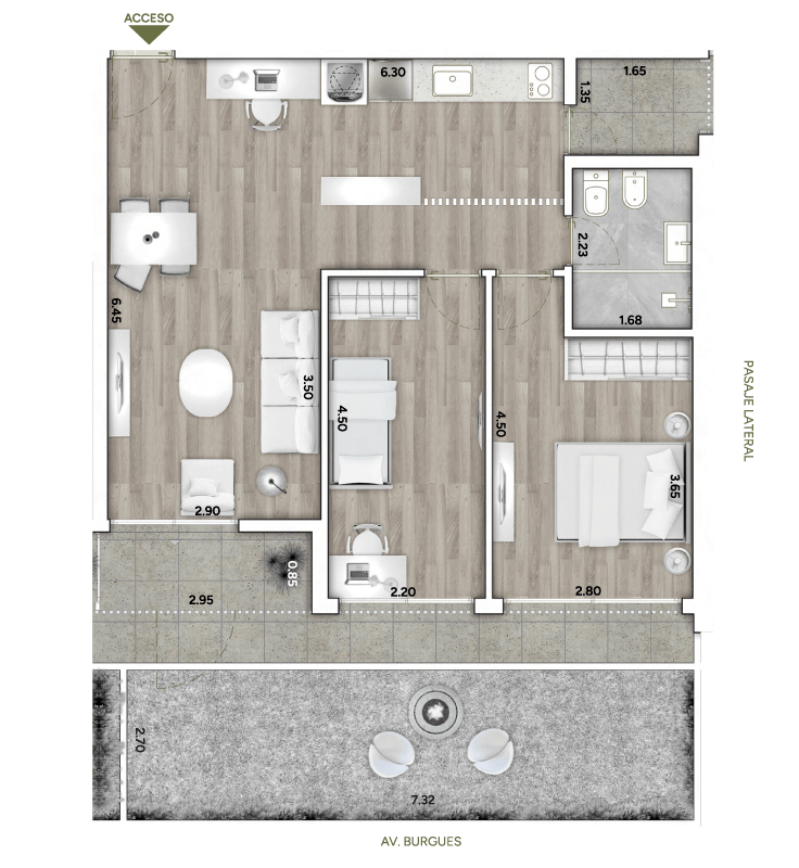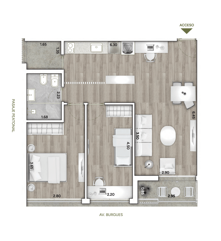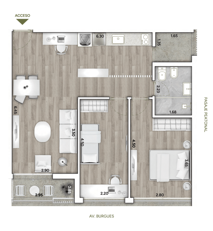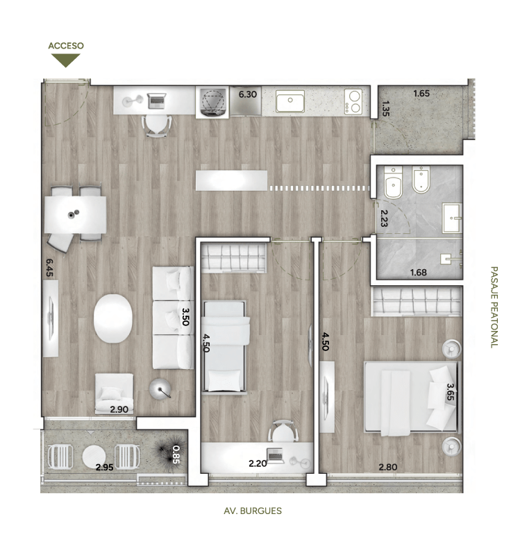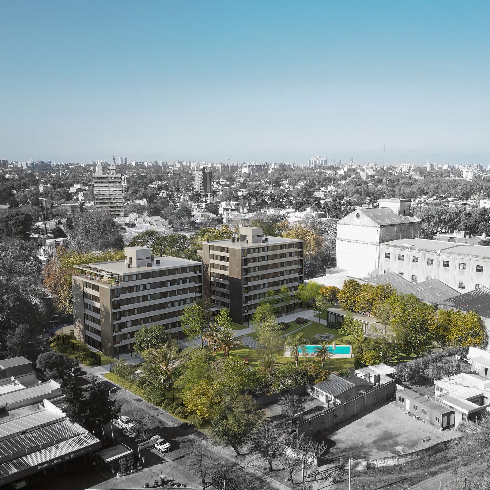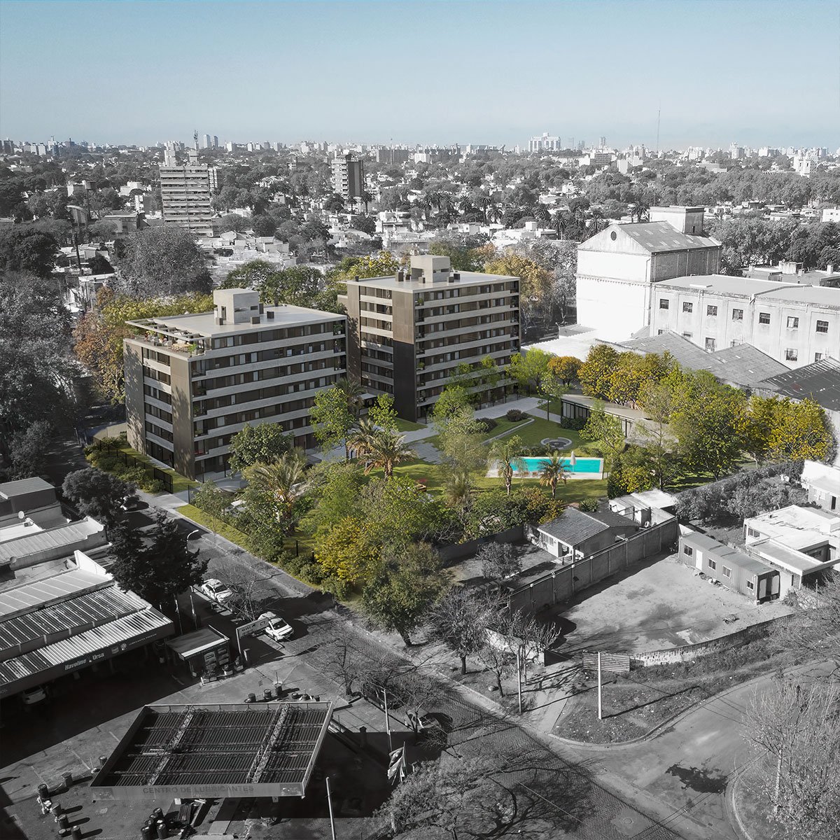 El proyecto consta de 2 torres de 6 y 7 pisos, con acceso independiente, conectadas en planta baja a través de un pasaje peatonal cubierto.