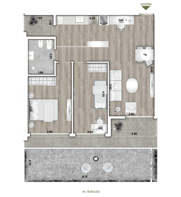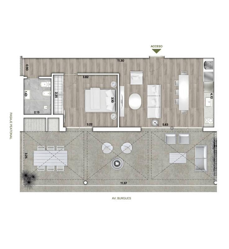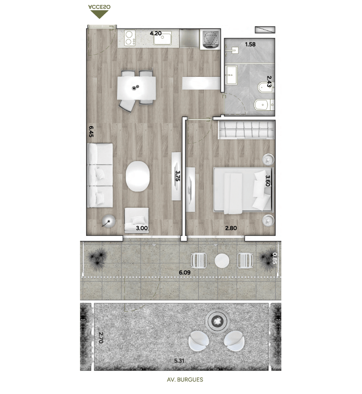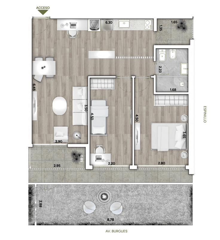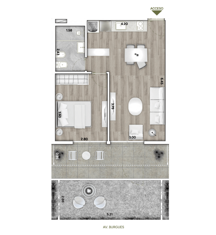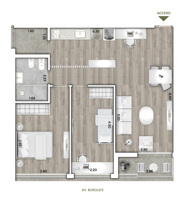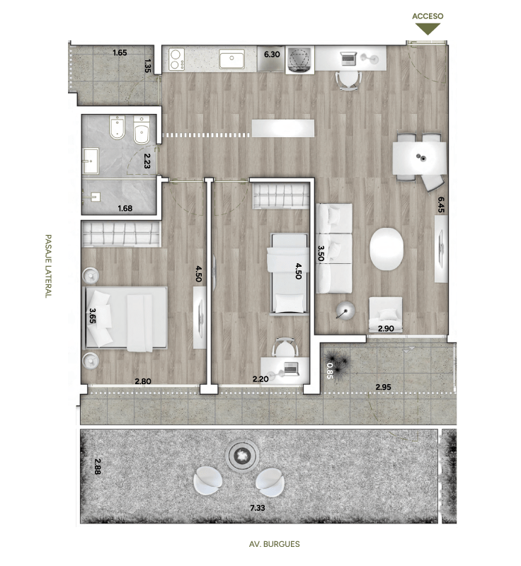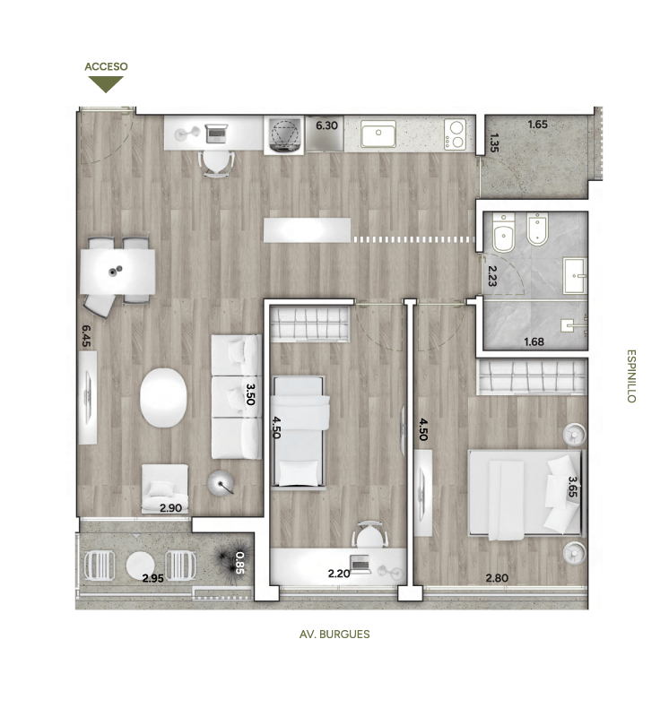 El proyecto consta de 2 torres de 6 y 7 pisos, con acceso independiente, conectadas en planta baja a través de un pasaje peatonal cubierto.